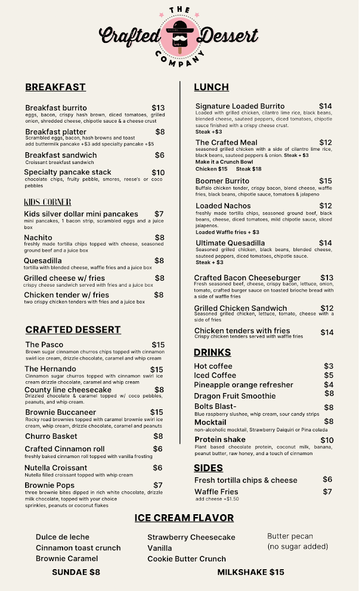 The Crafted Dessert Company is a sweet sanctuary nestled in Spring Hill, Florida, where every dessert tells a unique story. Our menu is a delightful blend of flavors designed to please and surprise. Indulge in our Crafted Espresso Sundae, featuring freshly pressed espresso paired with rich ice cream – a perfect duo for coffee lovers. Don’t miss the Hernando Cinnamon Sugar Churros Sundae, which brings a delicious twist to classic treats by combining churros with cinnamon toast ice cream and whipped cream.